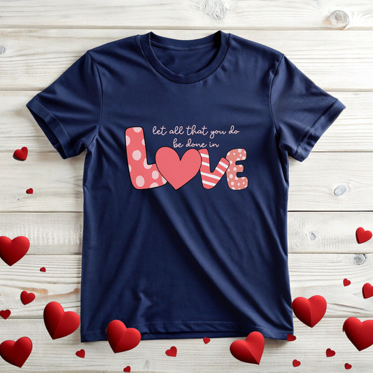 Tee with Let all that you be done in Love Text Design